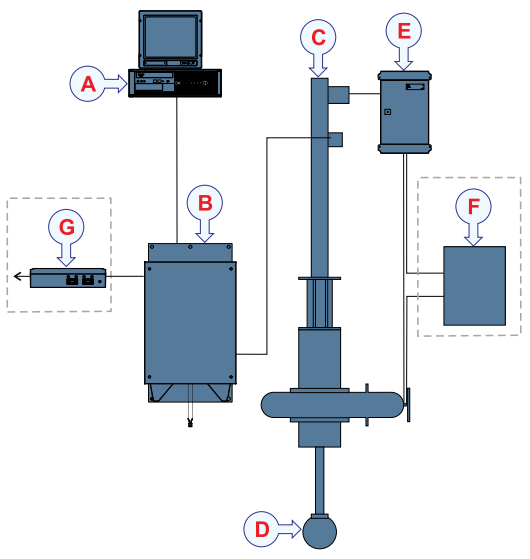 А. Станция оператора (Operator Station) B. Приемопередатчик (Transceiver) C. Спуско-подъемный механизм (Hull Unit) D. Антенна (Transducer) E. Блок управления подъемным механизмом (Hoist Control Unit) F. Блок управления запорной арматурой - Gate valve control unit – опция G. Приводной блок респондеров – Responder Driver Unit – опция